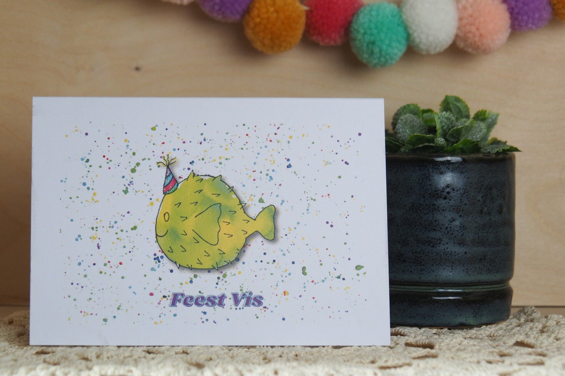 Elke kaart is uniek! Na het printen wordt er op elke kaart nog een glitter hoedje met de hand aangebracht.